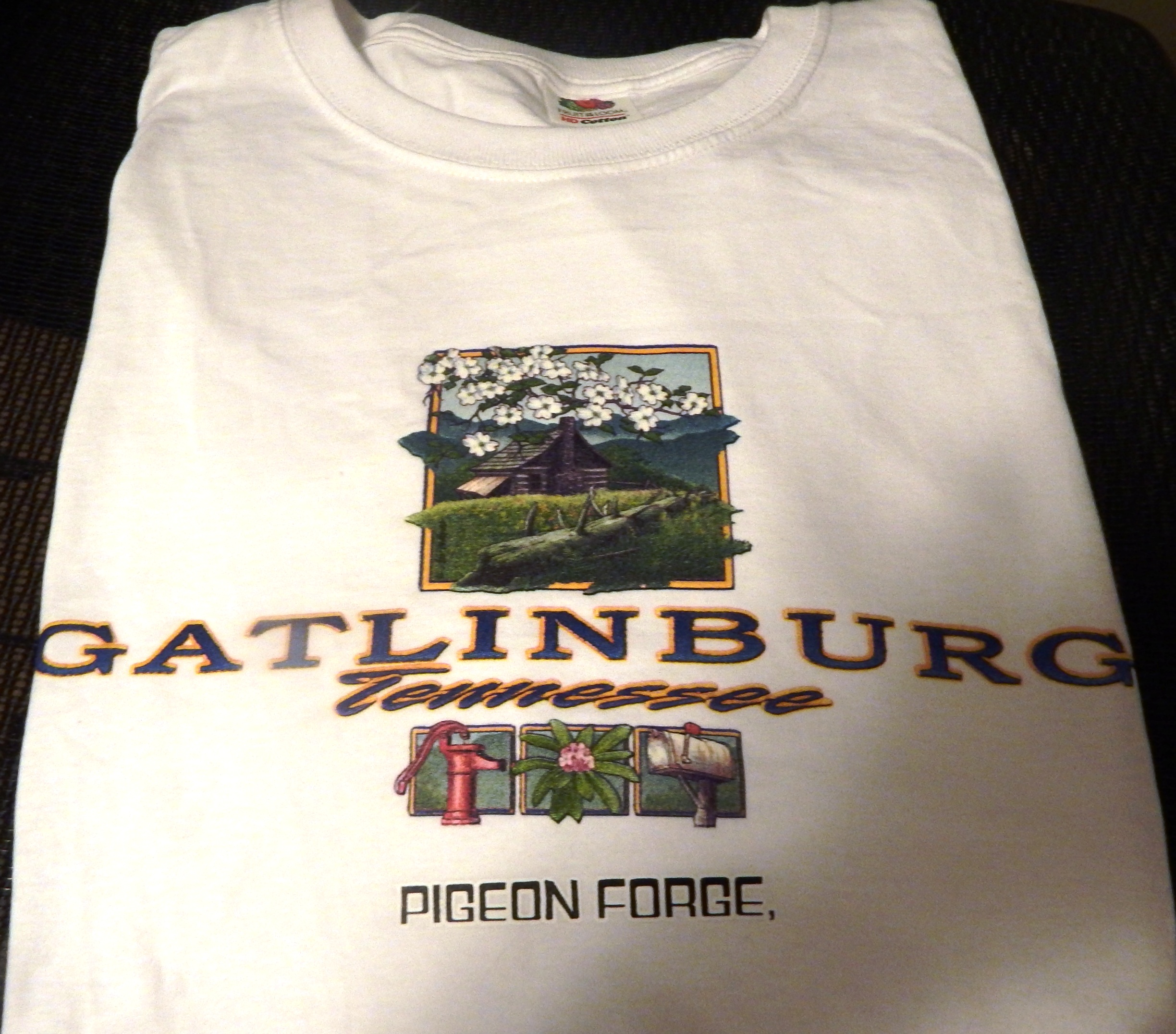 GATLINBURG T-SHIRT SIZE LARGE (One available) Large White T- Shirt - Fruit of the Loom 100% cotton -Top photo of 3x3 Cabin with Dogwood Flowers. Printed underneath photo: Gatlinburg Tennessee. Next word, "Tennessee" written in cursive with 3 1" photos underneath writing of well pump, flower, and mailbox.. All photos are color. Machine washable. Made in Honduras. |