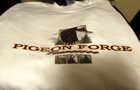 PIGEON FORGE SWEAT SHIRT SIZE LARGE (One available) Large White Sweat Shirt, Gildan Heavy Blend - 50% cotton/50% Polyester -Top photo of 3x3 Eagle. Printed underneath photo: Pigeon Forge Tennessee. Next word, "Tennessee" written in cursive with 3 1" photos underneath writing of tree cone, eagle, and a tree. All photos are color. Machine washable. Made in Honduras. |