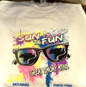 PIGEON FORGE/GATLINBURG SWEAT SHIRT SIZE LARGE (One available) Large White Sweat Shirt, Gildan Heavy Blend - 50% cotton/50% Polyester - Colorful photo with "Sun & Fun" written in large print. Black sunglasses with bear photo in lenses and "Great Smoky Mtns. written underneath. Bottom of photo is written Gatlinburg on left and Pigeon Forge on right. Machine washable. Made in Honduras. |
