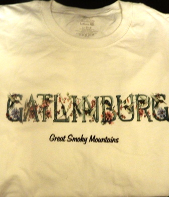 GATLINBURG/SMOKY MOUNTAINS T-SHIRT SIZE LARGE (One available) Large White T- Shirt - Fruit of the Loom 100% cotton - The word "Gatlinburg" is printed beautifully across the front aligned with beautiful pink flowers and green leaves. Printed below the word "Gatlinburg" are the works "Great Smoky Mountains." Machine washable. |